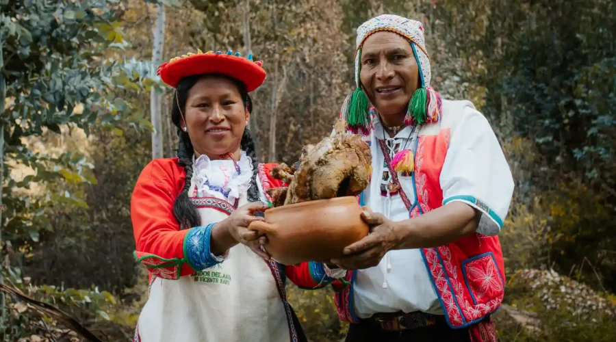 While the earth works its magic, the experience continues with a short trek through the Andean landscape and the sacred act of feeding the llamas, sealing a bond of trust and coexistence. Surrounded by ancestral stories and music, the ritual culminates in the “unearthing” of the banquet, followed by a communal feast in the open air.